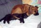 Mukamba, som til dagligt hedder Asia, bor sammen med sin mor og far og katten Pjuske - som for det meste er Asias bedste ven - på en stor gård med hesteopdræt. Asia synes det er dejligt at bo på landet. Hver dag følger hun med ud i stalden for at hjælpe til - og for at nyde de mange spændende lugte! Hun elsker at køre med i bilen og kender efterhånden Himmerland både på kryds og tværs. Men hun elsker også at ligge og slange sig foran brændeovnen og i solen eller ligge og dase på sofaen. Men hvem gør nu ikke det? Asia er blevet udstillet et par gange, og på Rhodesian Ridgeback Klubbens årlige Ridgeback Dag 2002, fik hun en flot placering som 4. bedste babytæve. Asia er en smuk tæve med et vidunderligt udtryk og Hazina's håber, at familien i Himmerland vil fortsætte med at udstille hende ind i mellem, så vi kan nyde hende i udstillingsringen. |