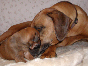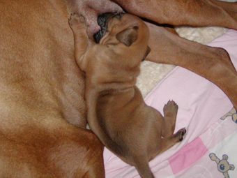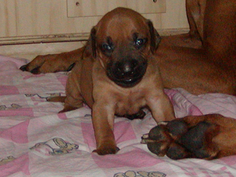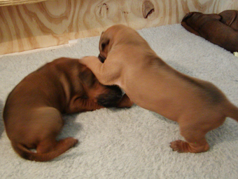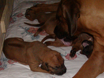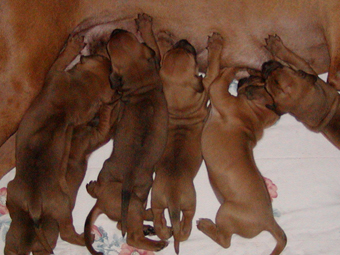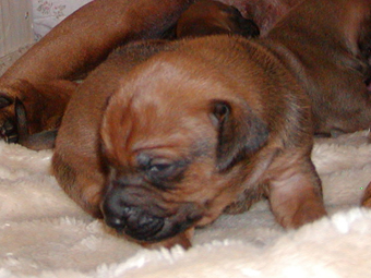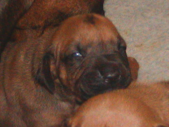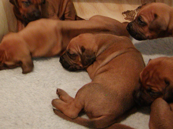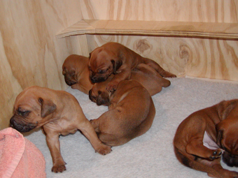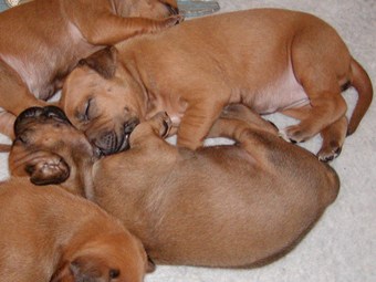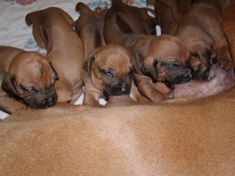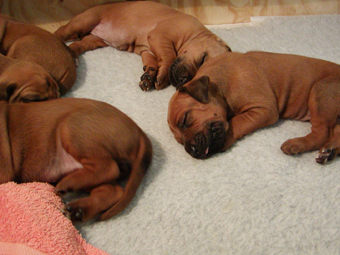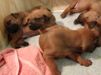 Tredie uge: Nu har de alle aabnet oejnene, der er ogsaa loesnet op for oererne, og de kan holde balancen paa alle 4 ben! De er begyndt at opdage hinanden, og proever at gumle lidt i en snude, et oere eller et ben, som de maatte stoede ind i paa deres vej. En sjaelden gang i mellem kommer der noget der ligner et bjaef, men ellers er det stadig smaa hyggelige lyde. Og forleden aften loed det som om en af dem sagde "Mor!". Hmmmmmmmmm |