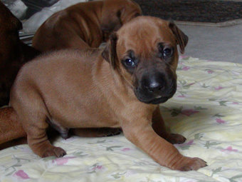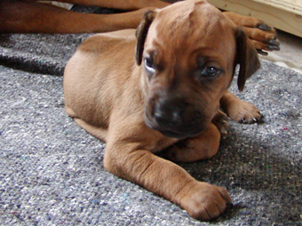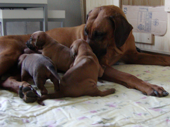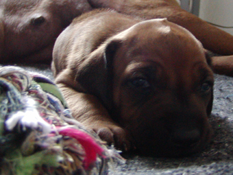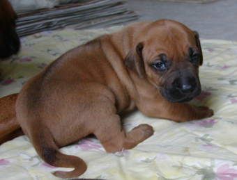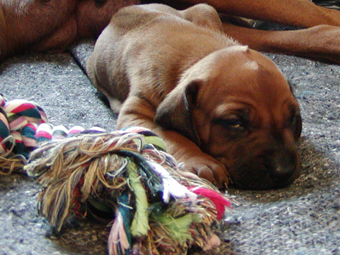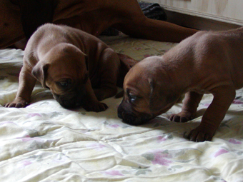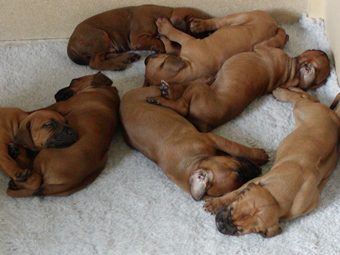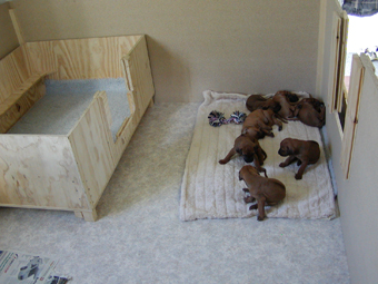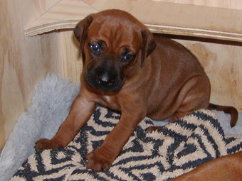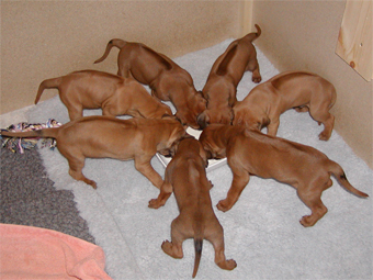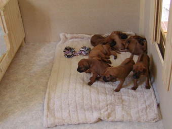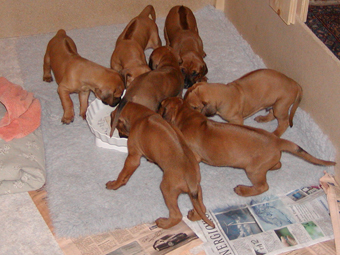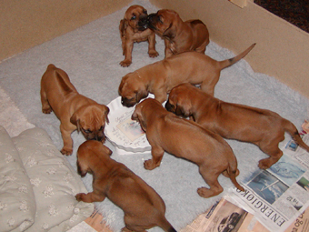 Fjerde uge: Det er svaert at holde balancen i starten, men det gaar hurtigt med at laere at koordinere alle 4 ben. Farveforskellen mellem de to moerke og de to lyse i kuldet er ikke saa stor laengere og alle har faaet de foerste maelketaender nu. I slutningen af ugen er hvalpene blevet introduceret til flydende mad i fad (maelkeerstatning). Deres naeser vokser, saa de er begyndt at ligne rigtige jagthunde!!! Hvalpekassen er flyttet ind i en loebegaard i stuen, saa nu har de meget mere plads at tumle rundt paa. |