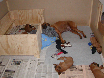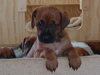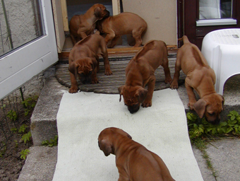 Sjette uge: Tiden gaar staerkt (for staerkt!) - nu er de smaa startet paa deres tredie sidste uge hos Hazinas. De spiser udblødt tørfoder nu og lidt A38 er der ogsaa plads til. Og saa har de faaet hver deres madskaal saa vi kan styre, at de alle faar den maengde mad de skal ha'. Og naar man er startet paa toerfoder, saa skal man selvfoelgelig ogsaa have adgang til vand! |