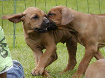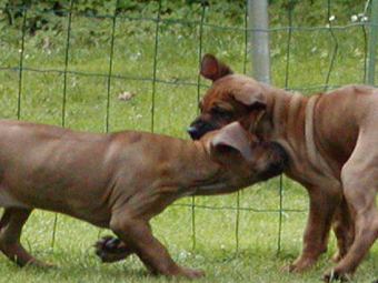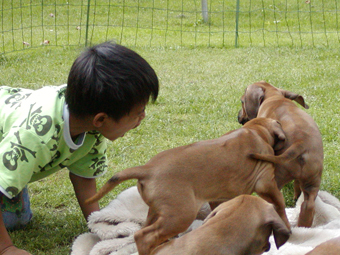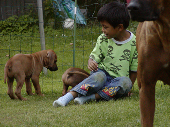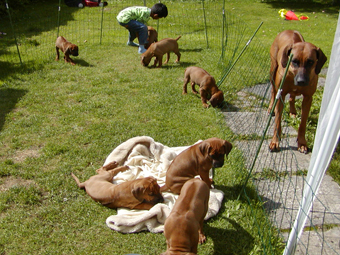 Ottende uge: Nu er de smaa snart 8 uger gamle. Vil de kunne klare at sige farvel til os. De er jo saa smaa. I loebet af de 8 uger er opdraettermor og -bror blevet MEGET knyttet til alle 7. Vi toer ikke taenke paa den dag de begynder at forlade os. Men det skal jo ske. Paa den anden side, saa er der 7 dejlige familier, som venter med laengsel paa at faa en lille hvalp med hjem i bilen. En lille hvalp at fodre, opdrage, og elske. Jo ... de faar det godt alle sammen. Det er vi helt sikre paa. |