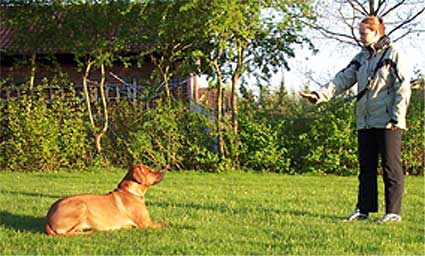 Her følger et referat af selve prøven: Mhiko’s lydighedsprøve klasse II d. 24/5 2003 Lørdag den 24/5 var en skrækkelig dag at skulle til lydighedsprøve med sin Ridgeback. Regnen plaskede ned hele formiddagen, og regn og vandpytter er ikke ligefrem fremmende for et højt motivationsniveau hos en solskins-elskende hund – og slet ikke i afdækningsøvelser! Så det var med særdeles begrænsede forventninger, jeg troppede op med min våde hund i snor, og meldte mig til prøve. For at rykke op i klasse 3 skulle vi mindst have 75 points. Jeg vidste, at Mhiko kunne hovedparten af øvelserne til bevidstløshed, men om han ville udføre dem i regn og rusk, se det er en anden sag… Først gik jeg ned til sporområdet (en mark med højt græs og buske) og lagde spor, dvs. jeg gik selv en ca. 100 m. lang strækning, med et 90 graders knæk, og markerede afslutningen ved at lægge en gammel pengepung af læder. Sporet skulle ligge mindst en halv time, før det skulle gås. Mens vi ventede på dette, gik vi op til ringene, hvor de resterende øvelser skulle finde sted. I den første ring skulle vi først lave lineføring. I klasse 2 er vi nået så langt, at træneren ikke længere dirigerer øvelsen, men føreren skal selv huske alle elementerne. De var følgende: Fremad gå, fremad løb. Omkring i gang, omkring på stedet, højre om, venstre om, tre skridt fremad, bagud, til højre og til venstre. Mhiko udførte øvelsen ok, men han var lidt langsom til at sætte sig på plads, hver gang han skulle – man skulle jo nødig blive våd i måsen! I alt fik vi i den øvelse 17 points ud af 20. Den næste øvelse var stå og afdækning. Føreren har hunden på plads, og går fremad med den uden snor. Så kommanderer føreren ”stå”, hunden bliver stående, og føreren fortsætter 15 meter ud og vender front mod hunden. Hunden skal stå stille i 1 minut, hvor efter føreren kommanderer ”dæk”. Hunden skal her efter ligge i 2 minutter. Trods mine forventninger klarede Mhiko dette perfekt, og vi fik 20 point ud af 20, med kommentaren ”meget, meget flot” på udtalelsen. I den anden ring lagde vi ud med springapportering – Mhikos helt klart værste disciplin! Ridgebacks er jo ikke en apporterende race, og den øvelse har jeg virkelig kæmpet med. I den ideelle øvelse sidder hunden på plads uden snor. Føreren kaster en dummy/ apportbuk over et spring (næsten lige så højt som hunden), og på kommandoen ”spring” skal hunden springe over forhindringen. På kommandoen ”apport” samler hunden apportgenstanden op, og på ”tilbage spring” springer hunden tilbage, sætter sig på plads og afleverer på kommandoen ”slip” apportgenstanden. Sådan gik det ikke helt for os. Mhiko sprang over, apporterede, men løb så uden om springet tilbage og afleverede apportgenstanden. Hmm! Alligevel fik vi 12 points ud af 20, og det var jeg meget tilfreds med! Den sidste øvelse i ringene var indkald under gang. Hunden sættes af, og føreren går et stykke ud, drejer nogle gange, og kalder på dommerens ordre hunden ind. Hunden skal løbe direkte ind på plads. Mhiko klarede også denne øvelse perfekt og fik 20 points ud af 20. Afslutningsvis gik vi det spor, jeg havde lagt til at begynde med, og bortset fra lidt manglende entusiasme i begyndelsen, gik Mhiko et pænt spor. Vi fik 15 points ud af 20. Alt i alt fik vi 84 points ud af 100, og bestod derfor klassen. Ret godt, synes jeg selv, for det er ikke nogen meget nem hund at træne med. Den er for intelligent! Nå, men hurra! Vi rykker op i 3. klasse – hvordan det så end kommer til at gå… Mange hilsner fra Helle og Mhiko |