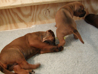 Tredie uge: Nu har de alle aabnet oejnene, der er ogsaa loesnet op for oererne, og de kan holde balancen paa alle 4 ben! De er begyndt at opdage hinanden, og proever at gumle lidt i en snude, et oere eller et ben, som de maatte stoede ind i paa deres vej. En sjaelden gang i mellem kommer der noget der ligner et bjaef, men ellers er det stadig smaa hyggelige lyde. Og forleden aften loed det som om en af dem sagde "Mor!". Hmmmmmmmmm |