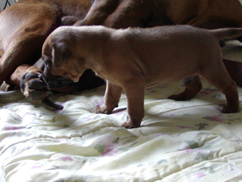 Fjerde uge: Det er svaert at holde balancen i starten, men det gaar hurtigt med at laere at koordinere alle 4 ben. Farveforskellen mellem de to moerke og de to lyse i kuldet er ikke saa stor laengere og alle har faaet de foerste maelketaender nu. I slutningen af ugen er hvalpene blevet introduceret til flydende mad i fad (maelkeerstatning). Deres naeser vokser, saa de er begyndt at ligne rigtige jagthunde!!! Hvalpekassen er flyttet ind i en loebegaard i stuen, saa nu har de meget mere plads at tumle rundt paa. |