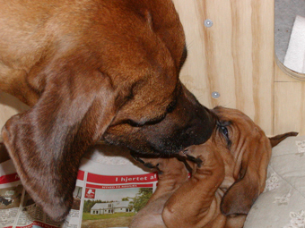 Femte uge: Nikolai er meget glad for de smaa hvalpe. Selv midt i en god leg eller en god film, saa skal han lige hen og checke, at alt gaar godt. Han har vaeret med til at navngive hvalpene, og 4 af dem har (selvfoelgelig) faaet fine navne fra Disney's ''Loevernes Konge'': Mufasa (Simba's far), Rafiki (mandrillen, Mufasa's kloge foelgesvend), Sarafina (Nala's mor) og Kiara (Simba og Nala's datter). BETYDNING: |