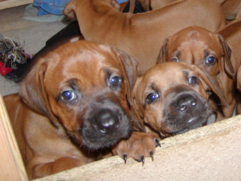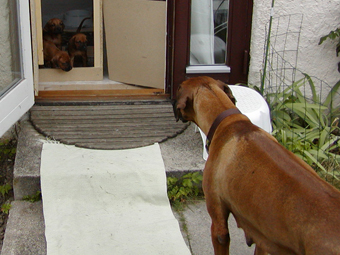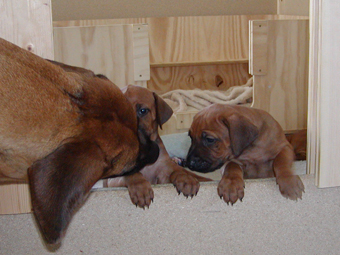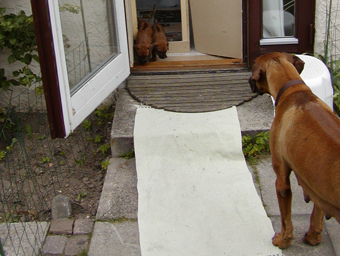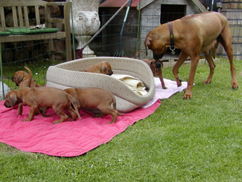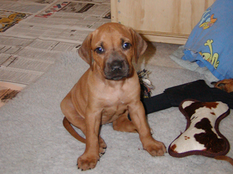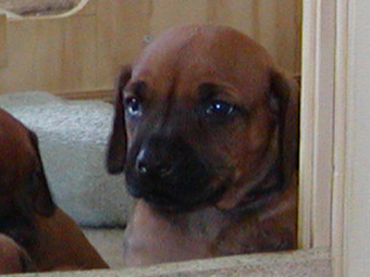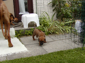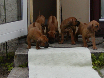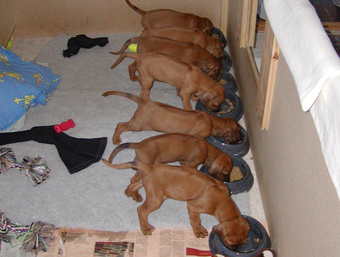 Sjette uge: Tiden gaar staerkt (for staerkt!) - nu er de smaa startet paa deres tredie sidste uge hos Hazinas. De spiser udblødt tørfoder nu og lidt A38 er der ogsaa plads til. Og saa har de faaet hver deres madskaal saa vi kan styre, at de alle faar den maengde mad de skal ha'. Og naar man er startet paa toerfoder, saa skal man selvfoelgelig ogsaa have adgang til vand! |